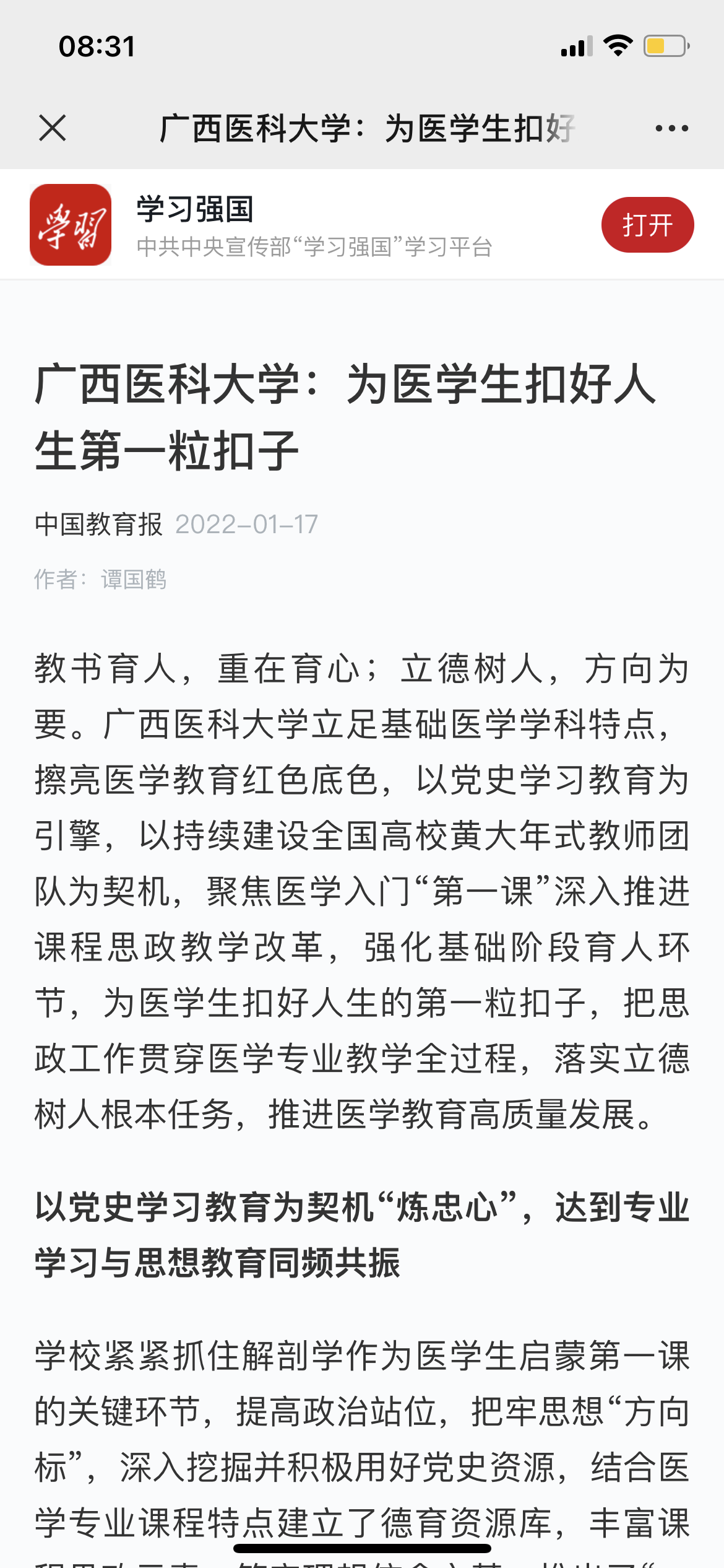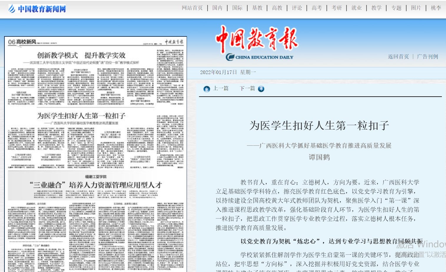 近日,《中国教育报》、学习强国刊登公司重点实验室主任、公司经理谭国鹤教授理论文章《为医员工扣好人生第一粒扣子——williamhill中文抓好基础医学教育推进高质量发展》。