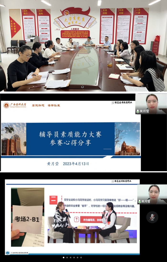 备赛期间,为增进参赛辅导员对大赛规则和赛程安排的了解,会务组召开赛前培训会,邀请第十一届广西高校辅导员素质能力大赛二等奖获得者、williamhill官方网站辅导员黄月莹老师进行线上专题分享,详细介绍了基础知识测试、谈心谈话和案例研讨的赛制规则,并分享备赛心得,传授应试技巧。