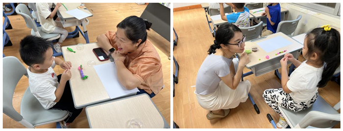 支部党员和幼儿园老师引导协助小朋友制作黏土模型