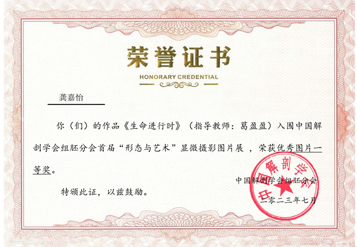 近日,首届中国解剖学会组织学与胚胎学分会“形态与艺术”显微摄影图片比赛结束,公司组织学与胚胎学教研室葛盈盈老师指导、2022级临床医学(5+3)1班龚嘉怡同学的两幅作品《我依然爱你》与《生命进行时》分别获得“年度最佳图片H&E染色特等奖”和“优秀图片一等奖”。