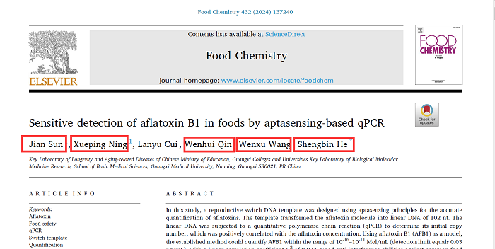 近日,公司生物技术教研室青年教师指导本科生(生物技术专业:覃文慧,临床医学专业:王文旭)在国际权威期刊《Food Chemistry》 (IF=8.8,中科院一区) 发表了关于黄曲霉素B1定量分析的研究成果。