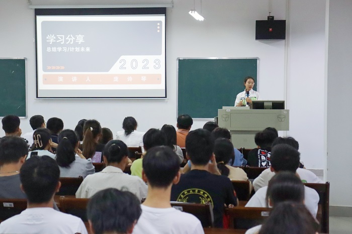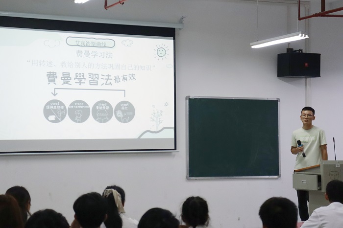 “善学者尽其理,善行者究其难。”学习经验分享环节,“学霸”们将自己的“高分秘籍”倾囊相授:2219班彭美乐解析艾宾浩斯曲线介绍学科记忆方法,推荐使用“费曼学习法”提升复习效率;2206班江彩梦分享了课前、课中、课后不同阶段的学习策略与方法;单科成绩优秀代表2201班庞诗琴分享学习生理学和生物化学的技巧;成绩进步代表2203班王亮讲述自己的“逆袭”经历和提高学习效率的方法。