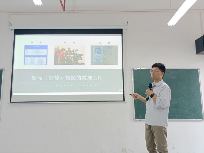 本期论坛邀请了南宁职业技术公司传媒公司新闻采编与制作专业负责人、国家高级摄影师兰海洋副教授专题讲授《新闻摄影中有形/无形的“形容词”》。兰副教授从新闻摄影师具备的新闻素养、拍摄技巧、摄影常规程序、如何提升摄影水平的建议四个方面深入浅出地传授拍摄经验。他详细阐述摄影前期获取新闻线索、做好攻略、提前踩点;中期抢占最佳机位,开启连拍模式;后期照片整理、图文编辑。兰副教授毫无保留地给与会人员传授摄影技术,让新闻摄影师传递新闻价值、摄影表现力、文字说明精当,把有形的环境对象与无形的形象展现得淋漓尽致。与会人员纷纷表示,兰海洋副教授的讲座干货满满,使我们视野开阔、思维拓展、意识提高。