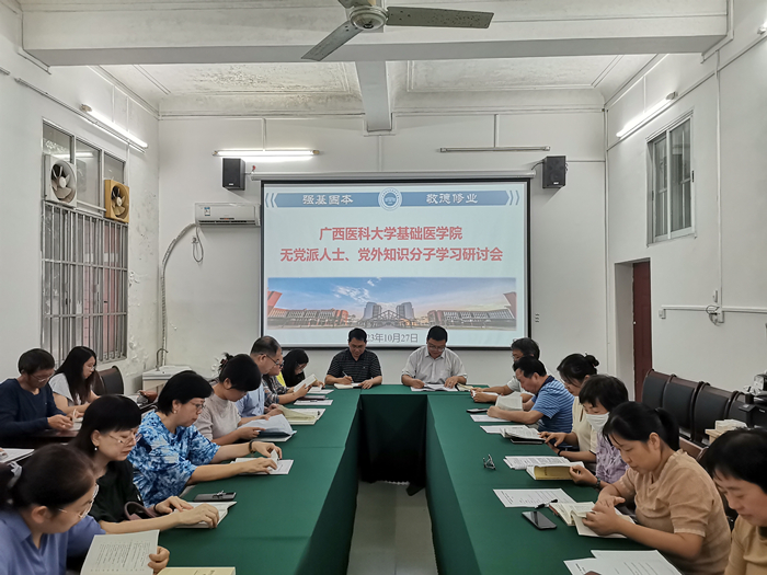 座谈会后,无党派人士和党外知识分子代表开展了第一次集中学习研讨。谭机永书记带领大家集中学习《习近平新时代中国特色社会主义思想学习纲要》部分内容,并对该书的内容架构和如何学好用好这本重要辅导读物进行详细说明。无党派人士张庆梅教授领学习近平总书记关于教育的重要论述,重点围绕新时代“教育三问”进行学习阐释。随后,无党派人士程乐平教授、党外知识分子杨晓梅副教授分别结合学习内容和工作实际分享心得体会。