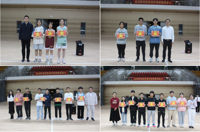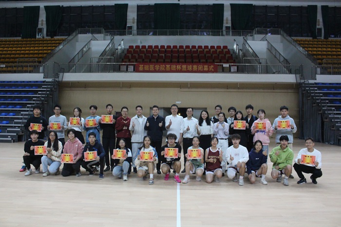 闭幕式上,团委副书记宋传权致辞,他肯定了篮球比赛的开展对激发同学们的运动热情以及增进同学间友谊的积极作用,并鼓励大家坚持运动,健康生活。随后,由团委副书记谭璟婧宣读比赛结果,并由各位老师为获奖班级颁奖。最后,由李文奇副书记宣布闭幕式圆满结束。本届“基础杯”篮球赛在合影留念中落下帷幕。