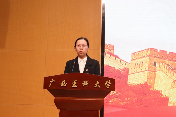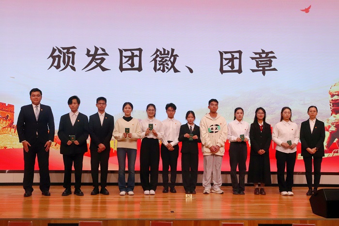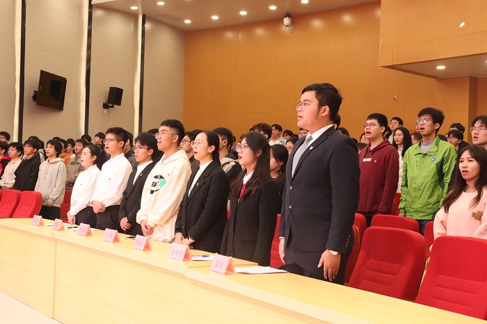 大会伊始,全体成员庄严肃立,奏唱国歌。随后,黄舒慧同学宣读新团员名单,由梁福秋老师及团干部代表为新团员颁发团徽、团章,全体团员进行入团宣誓。接着,入团介绍人代表金建东宣读团章中有关团员义务和权利的条款。然后,老团员代表蓝川、新团员代表彭玉桂依次上台发言,分享对团的认识及入团感受。团委书记梁福秋寄语新团员,要贯彻落实习近平总书记提出的新时代共青团员“五个模范、五个带头”的重要要求。她鼓励青年团员带头迎难而上、攻坚克难,发扬斗争精神,争当伟大理想的追梦人。大会的最后,全体成员齐唱中国共产主义青年团团歌。至此,本次入团仪式圆满结束。