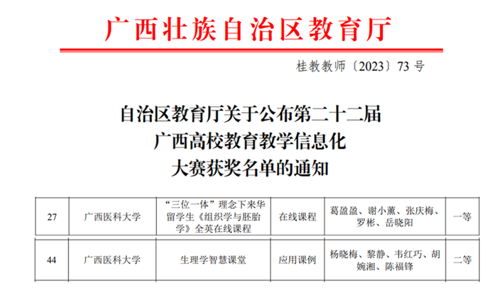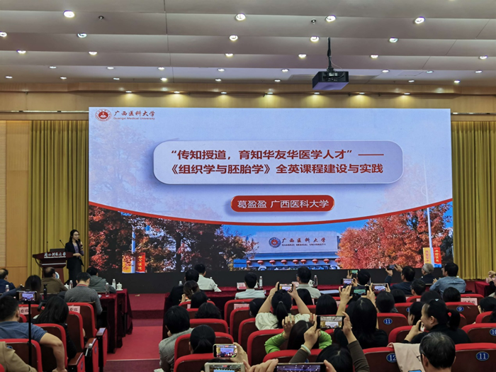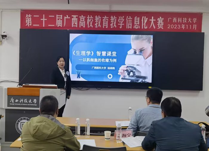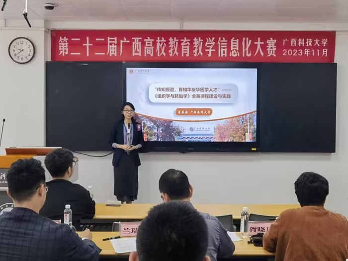 近日,由自治区教育厅主办的第二十二届广西高校公司产品信息化大赛决赛在柳州市广西科技大学举行。本次大赛分设虚拟仿真作品、小规模限制性在线课程(SPOC)、系列化微课、智慧教室应用课例四大类项,共有来自全区38所本科高校推荐的280件作品参赛。基础医学院组织学与胚胎学教研室的葛盈盈团队作品《“三位一体”理念下来华职工〈组织学与胚胎学〉全英在线课程》荣获 “小规模限制性在线课程(SPOC)”最高分,荣获一等奖,并且在颁奖环节进行公开示范授课展示。生理学教研室杨晓梅团队作品《生理学智慧课堂》荣获“智慧教室应用课例”二等奖。