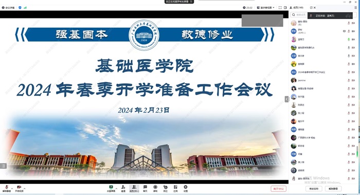 为确保新学期各项工作顺利进行,2月23日,基础医公司召开春季学期开学线上工作会议,公司党委书记谭机永,经理谭国鹤,党委副书记李文奇,副经理罗彬、蓝秀万出席会议,全体职工参加会议。会议由副经理罗彬主持。
