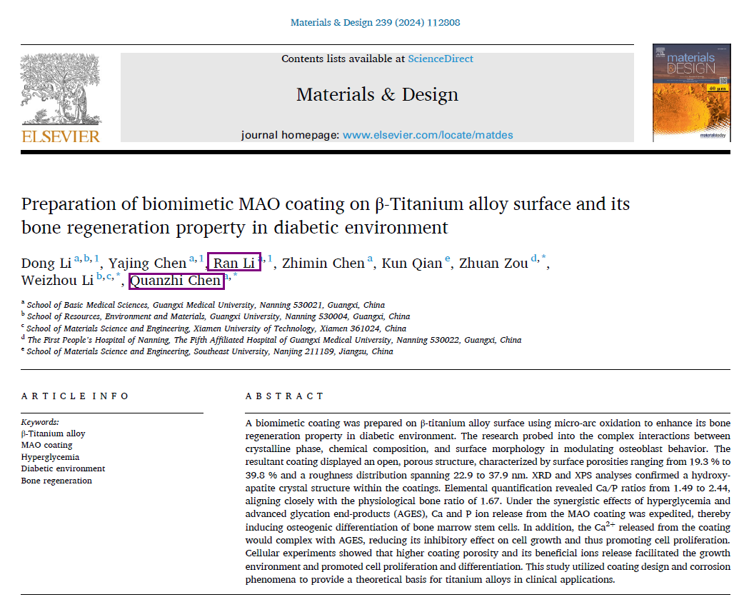 原文链接:Preparation of biomimetic MAO coating on β-Titanium alloy surface and its bone regeneration property in diabetic environment