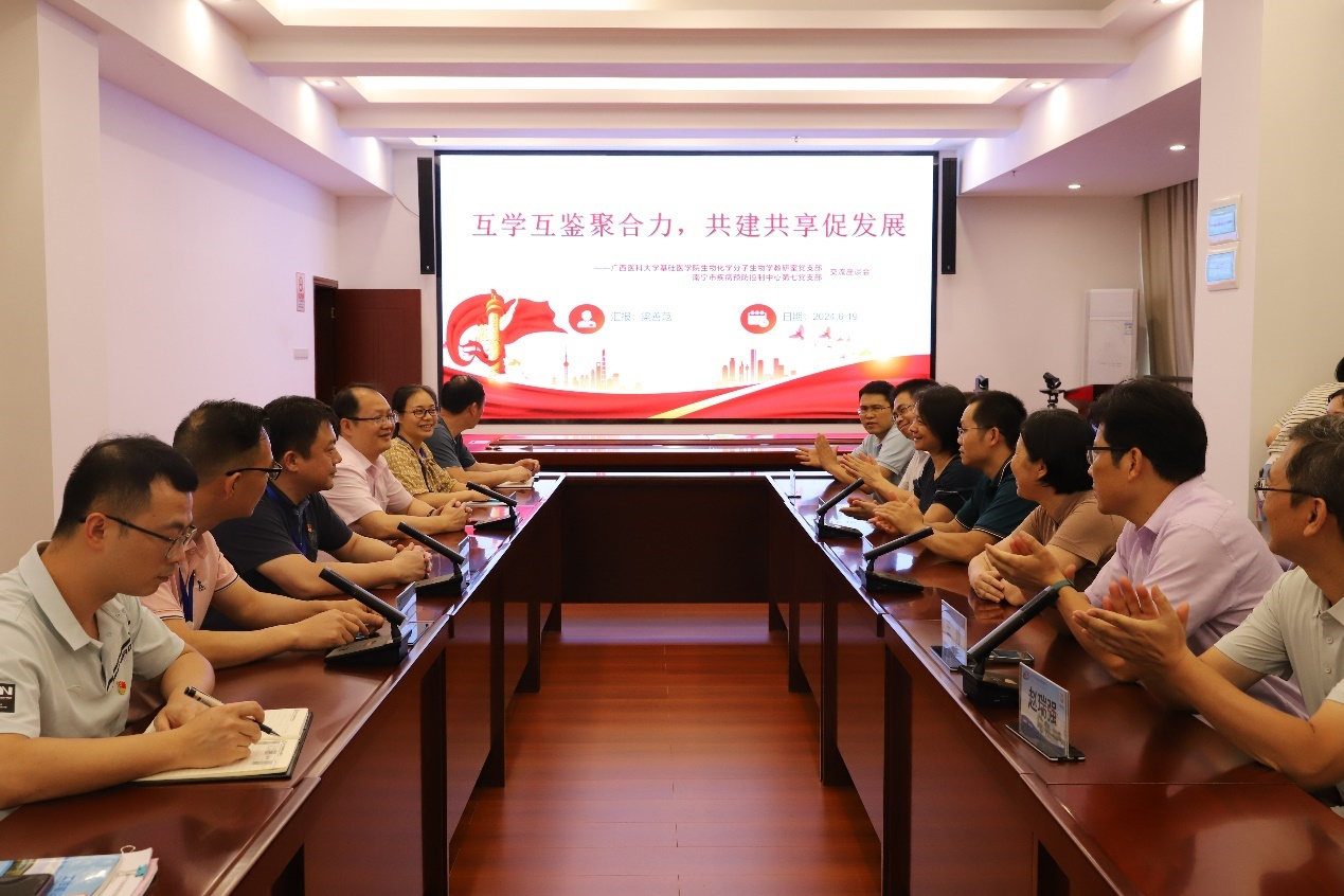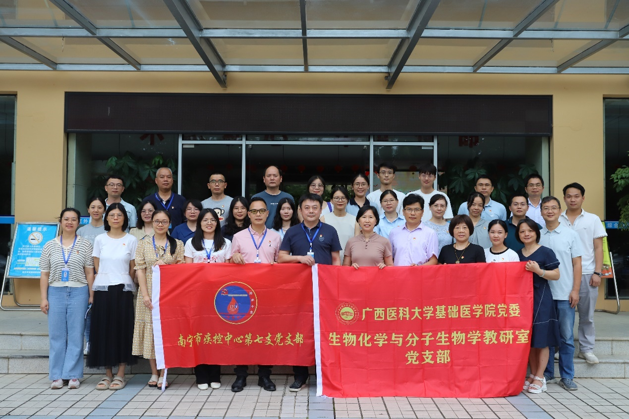为进一步推动党建与业务融合,持续打造“以学促干,助力科研”支部品牌,6月19日下午,williamhill官方网站生物化学与分子生物学教研室党支部组织支部党员及科室教师代表赴南宁市疾病预防控制中心第七党支部开展党建与科研合作联建活动。