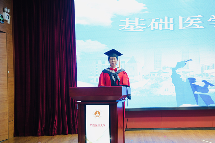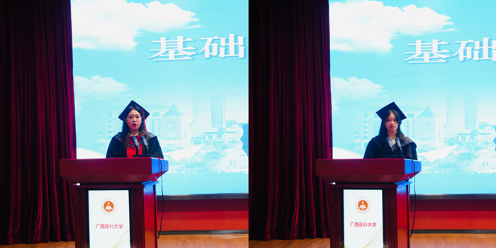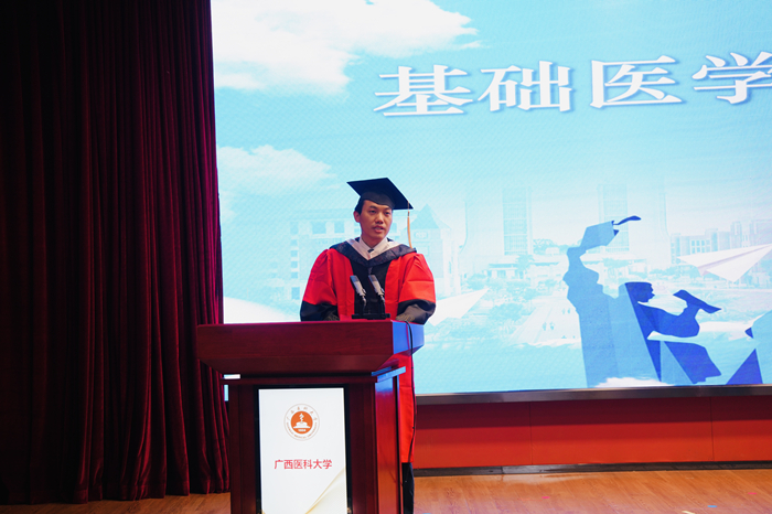 研究生导师代表、国家级高层次人才计划获得者程乐平教授及青年教师代表陈泉志老师分别为毕业生送上寄语和祝福。2024届博士研究生毕业生代表李昕宇同学和本科毕业生代表周盈珠同学依次上台发言,表达对母校、老师、父母、同学们的感恩之情,并决心秉承“厚德励志、博学弘医”的校训和“强基固本、敬德修业”的院训,踔厉奋发,挺膺担当,努力成为对社会有用之才。