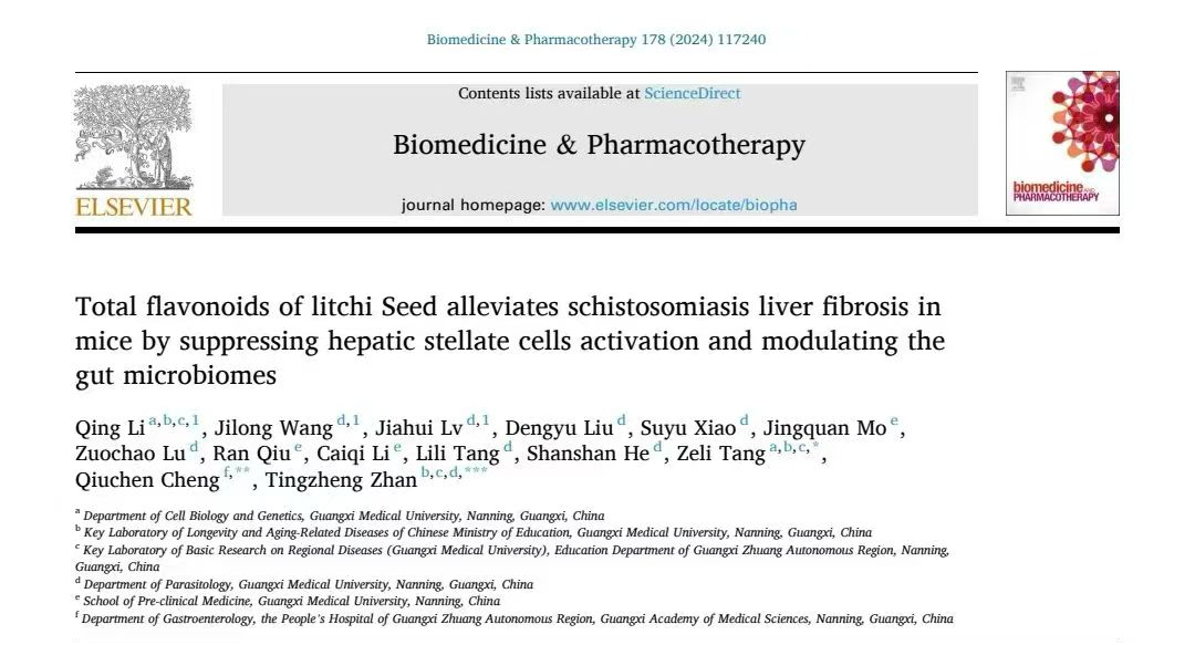 近日,公司战廷正副教授团队在国际药学科学期刊《Biomedicine & Pharmacotherapy》(IF:6.9,Q1,中科院药学一区,TOP期刊)上,发表题为“Total flavonoids of litchi Seed alleviates schistosomiasis liver fibrosis in mice by suppressing hepatic stellate cells activation and modulating the gut microbiomes”的最新研究成果。