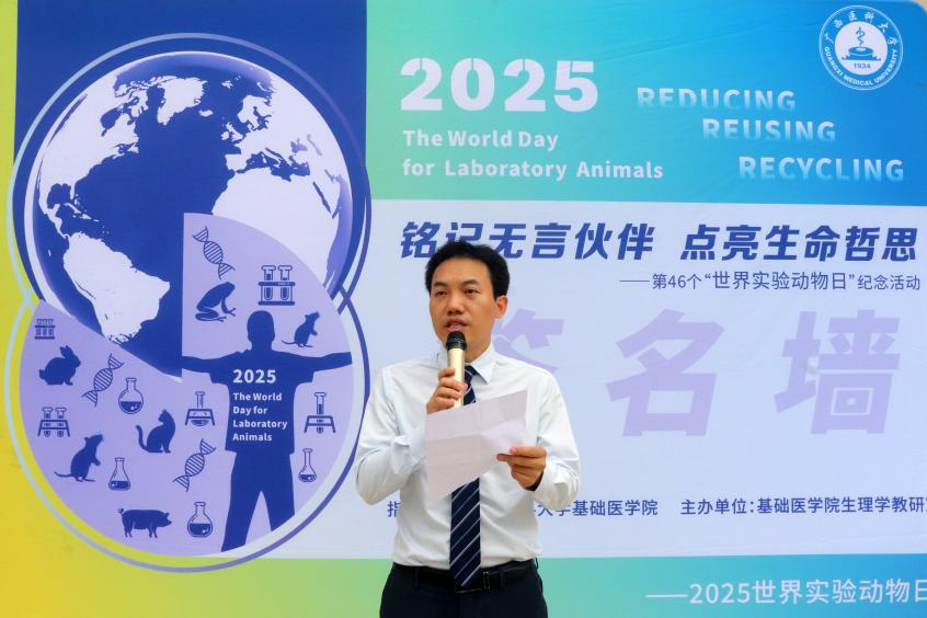 为铭记实验动物的贡献,激励员工以严谨态度对待医学研究,以仁爱之心践行医者使命,近日,由williamhill官方网站指导、生理学教研室党支部主办的“铭记无言伙伴 点亮生命哲思”——第46个“世界实验动物日”纪念活动在武鸣校区A3栋格物楼前广场举行。